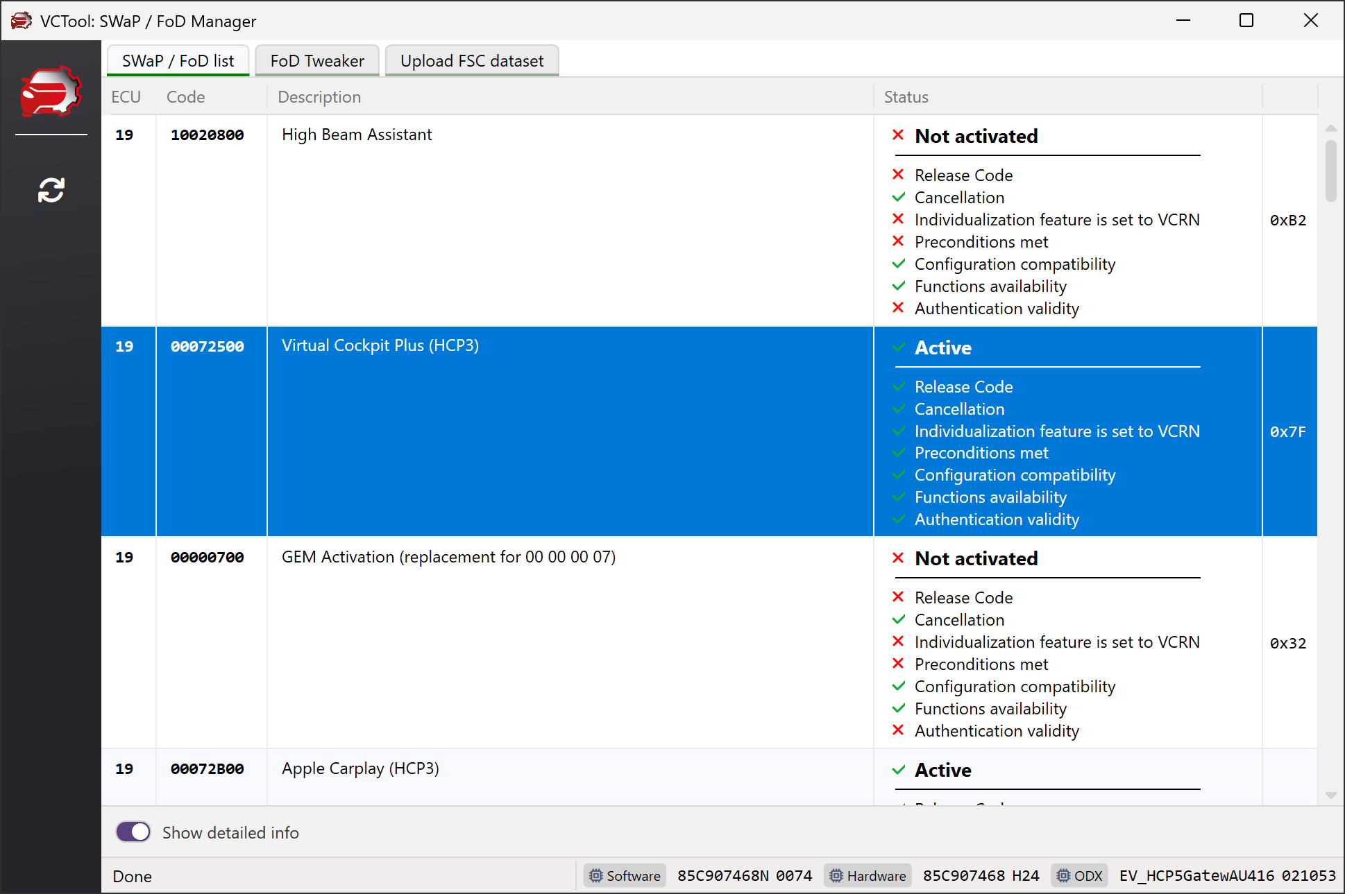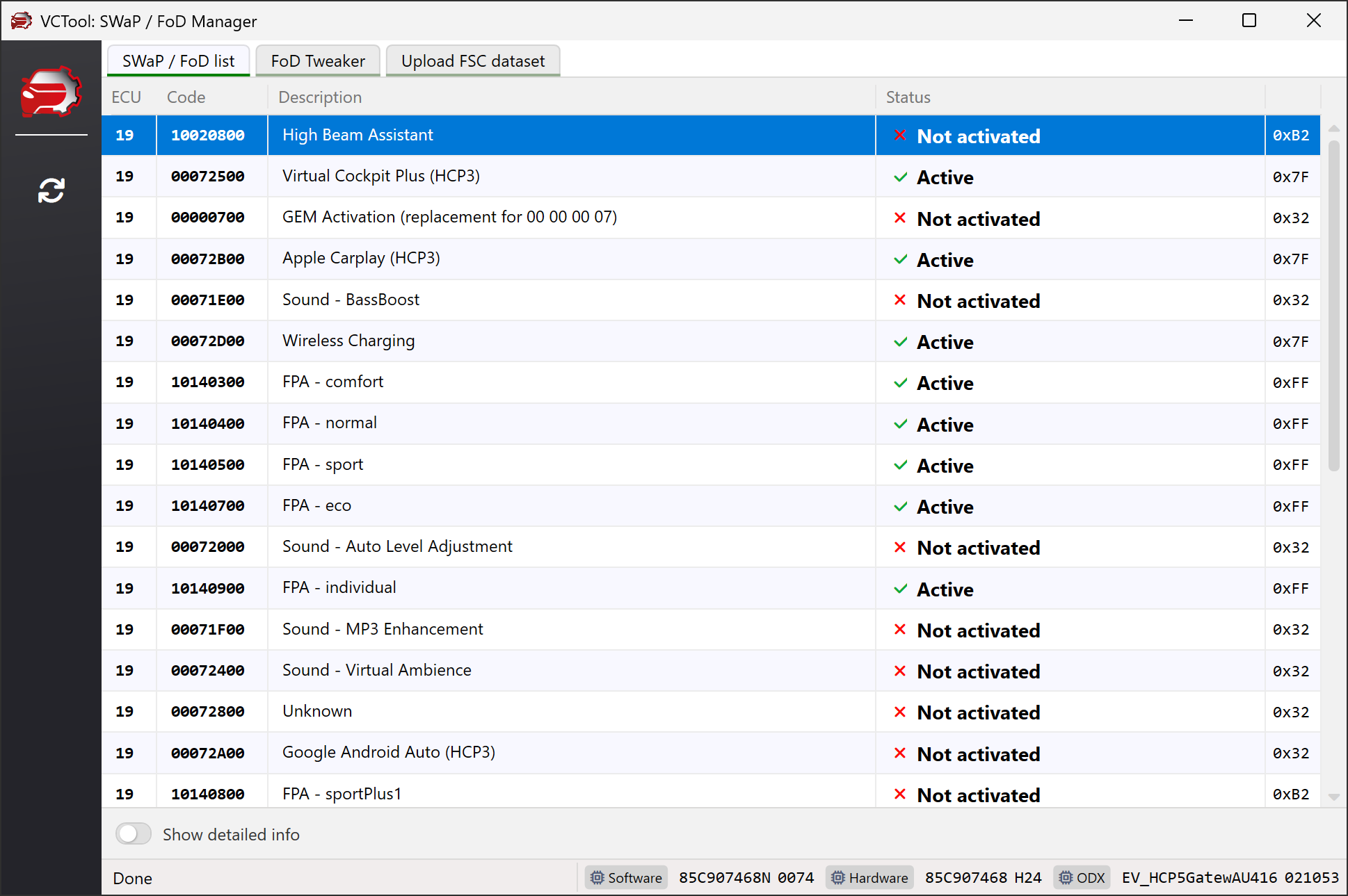 Менеджер SWaP предоставляет исчерпывающую информацию о установленных кодах SWaP/FoD в автомобиле, включая подробные описания статусов. Также он предлагает удобный инструмент для активации FS ID в автономном режиме одним кликом через загрузку датасетов FSC.